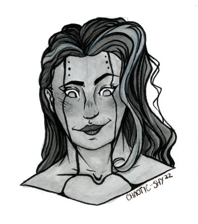Often seen as a woman in her mid twenties wearing a long flowing black traveling cloak and walking with a lantern-stick. Long onyx-black hair with a golden streak framing her face. Dark tattoos around the smoky blind eyes. Tattoos running the entirety of her body culminating in her index fingers, which are completely covered in black. She carries a long straight and feathered smoking pipe.